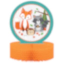 Borddekoration med honeycomb i farverne orange og blå/grøn med sødt motiv af en ræv, et pindsvin og en vaskebjørn. Pynt bordet med dette, når det tid til dyrefest. Dekorationen er ca. 23 x 30 cm i størrelse.