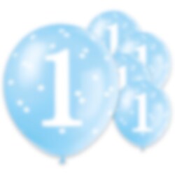 5 stk. lyseblå latexballoner med motiver af tallet 1 og firkanter i hvid farve. Perfekt at pynte rummet med til en 1-års fødselsdag. Ballonerne er ca. 30 cm i diameter oppustet og pustes op med luft eller helium.