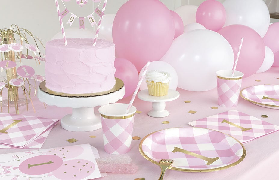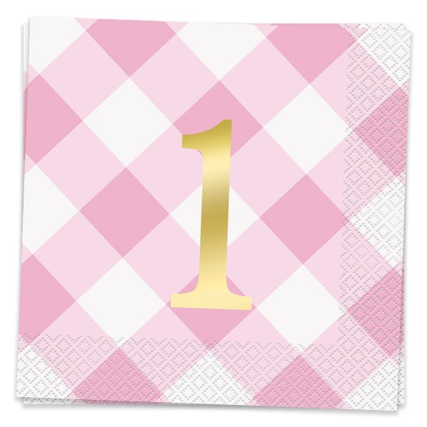 16 stk. servietter i et fint lyserødt og hvidt ternet mønster med motiver af en guld foliebelagt 1-tal i midten. Flot at dække bordet med til en 1-års fødseldagsfest. Servietterne er 2-lags og er ca. 33 x 33 cm store, udfoldede.