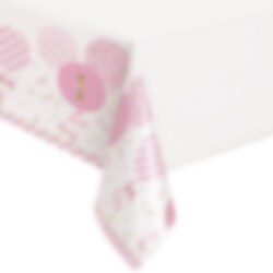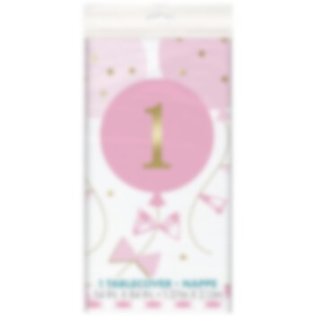 Dug af plastik med en hvid baggrund og motiver af lyserøde balloner, sløjfer og tallet 1 i guldfarve. Et fint tilbehør til bordet inden 1-års fødselsdagen. Dugen er ca. 137 x 213 cm i størrelse.