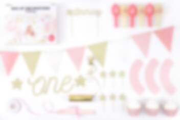 Dette færdige dekorationssæt med 1-årstema i lyserød og guld inkluderer: