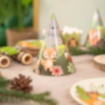 6 stk. festhatte i smukke farver med søde motiver af skovdyr, perfekte til en fødselsdag med skovtema.