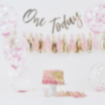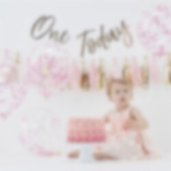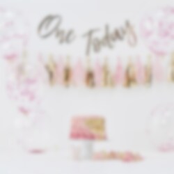 Smash Cake kit i farverne lyserød og guld, som du kan bruge til at tage søde kort under 1-års festen. Pakken inkluderer: