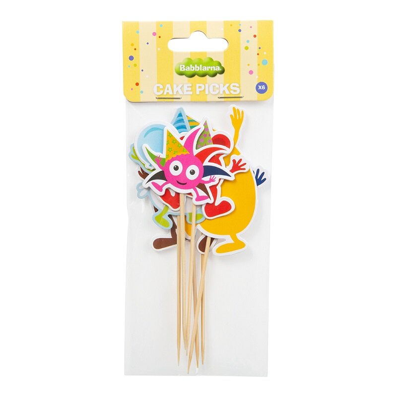 6 stk. cake toppers med lækre Babblarna motiver. De er smukke at dekorere kager og muffins med. De er lavet af træ og pap.