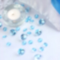 100 stk. flotte "diamanter" i en lyseblå/turkis tone til at pynte bordet med, når der er fest. Diamanterne er lavet af akrylplast, men ser ægte ud og funkler flot i lyset. Diamanterne er ca 12 mm i diameter.