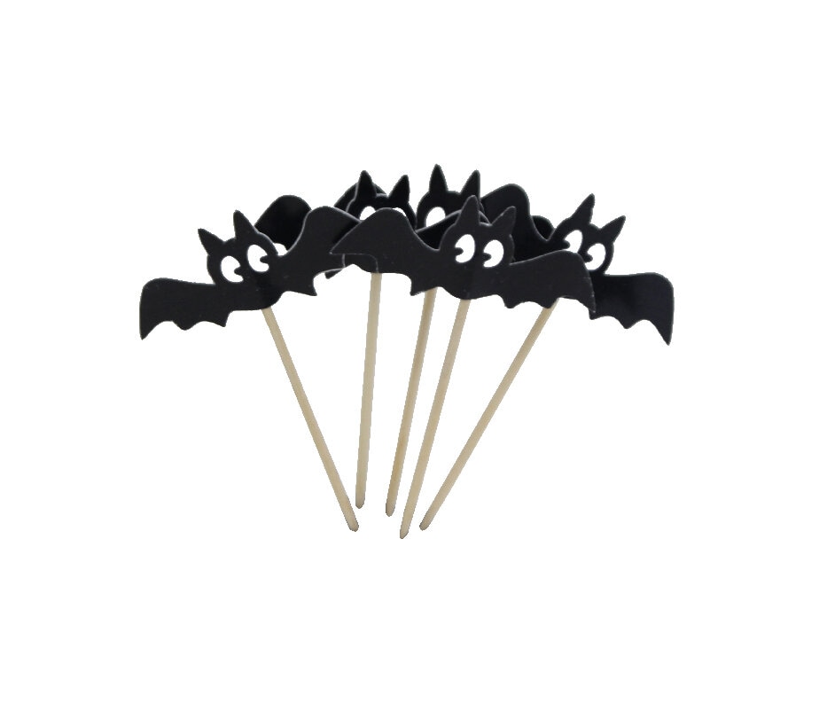 5 stk. partypicks med motiv af søde små flagermus på toppen. Gør bagværket ekstra fint med disse picks før festen eller fest med Halloweentema. Picksene er ca 6,5 cm høje.