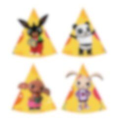 8 stk. festhatte med et sødt motiv af de forskellige karakterer fra serien Bing. Hattene er omkring 16 cm høje og holdes på plads med en elastik.