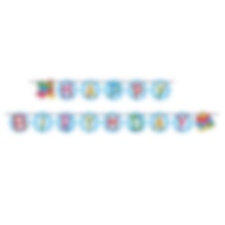 Farverig guirlande af papir med teksten "Happy Birthday" og sjove byggeklods-motiver. Guirlanden er 2,95 meter lang, og bogstaverne er cirka 15 cm høje. Den er fin som dekoration til en LEGO inspireret fødselsdag.