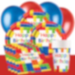 Skab en farverig fødselsdag fyldt med leg og fantasi! Med vores byggeklods-festpakke bliver det nemt at holde en sjov og stemningsfuld børnefødselsdag, hvor alt passer perfekt sammen i det glade tema. Tallerkener, papkrus og servietter har farverige byggeklodser med Happy Birthday-motiv, og de matchende balloner og den røde borddug fuldender det festlige fødselsdagsbord.