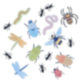 Dekorationerne er lavet af FSC-mærket pap og varierer i størrelse fra 6 cm til 21 cm. Pakken indeholder en blanding af mariehøns, biller, bier, guldsmede, edderkopper, larver, orme og myrer, samt limprikker for nem opsætning.