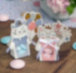 6 små æsker i hvid og lyserød med en kat, der er klar til en fest. Fyld dem med noget godt, og sæt dem på bordet som en fin gave til dine gæster, når det er tid til en fest med kattetema. Æskerne måler ca. 12,5 x 3 x 12,5 cm og leveres med satinsnor.