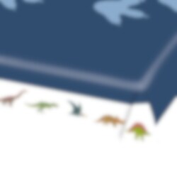 Stilfuld dug mørkeblå og hvid af papir, med mange forskellige dinosaurer motiver. Duggen er omkring 115 x 175 cm i størrelsen.