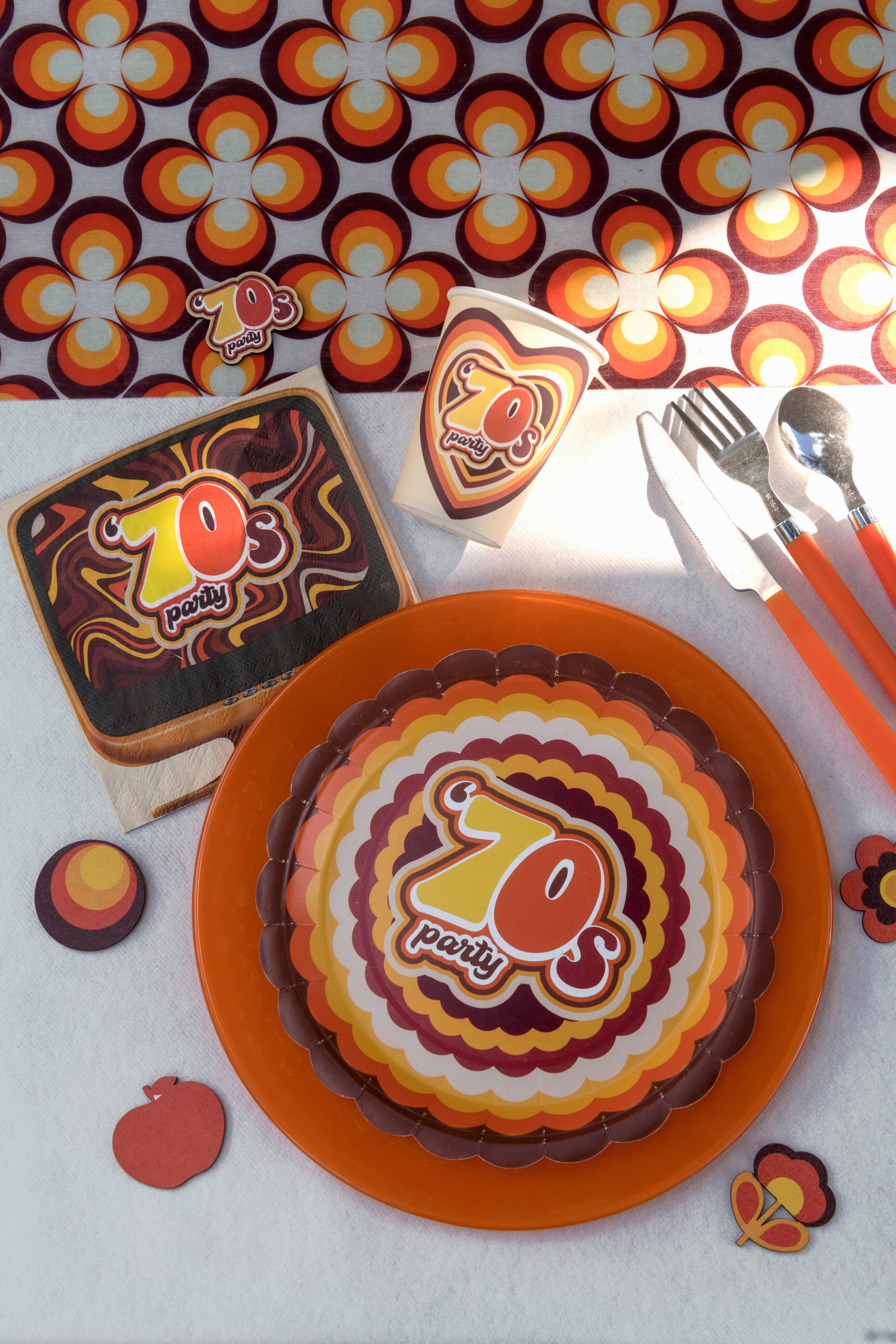 10 stk. paptallerkner i lækker retrostil fra 70'erne. Tallerknerne passer lige så godt til en 70'er-fest som til et disco, og de er 22,5 cm i diameter.