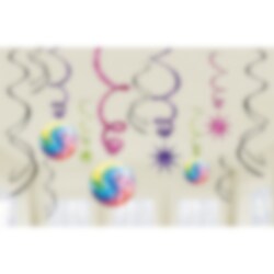 Seje hængende pynter med Discotema. Gør din fest komplett med disse og det vil føles at du og dine gæster har rejst tilbage til 70-talet. Lad festen begynde! Indeholder 6 dekorationer 3 stk er ca 17,7 cm lange 3 stk er ca 10,1 cm lange.