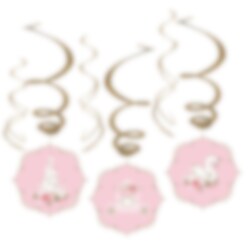 6 stk. hængende dekorationer, hvoraf 3 stk. har prinsessemotiver på begge sider og 3 stk. er swirls. En passende dekoration at have med til prinsessefesten. Dekorationer med motiverne er ca. 80 cm lange, mens swirlsene er cirka 45 cm lange.