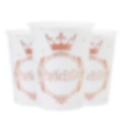 10 papkrus i en flot hvid farve og med et sjovt prinsessemotiv i rosa guldfolie. Super flot at have med til borddækningen til din prinsfest. Match krusene med tallerkener, servietter og andet tilbehør i samme tema for at få den perfekte borddækning. Krusene er ca. 9,7 cm høje og har et rumindhold på 270 ml.