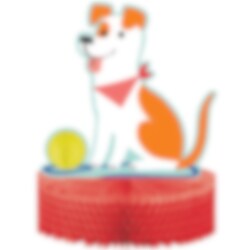 Borddekoration af rød honeycomb med et motiv af en hund og dens bold. Dekorer bordet med denne når der er fest med hundetema. Borddekorationen er ca. 23 x 30 cm i størrelsen.