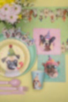 Sjove servietter med et festligt hundemotiv, som passer perfekt til fødselsdag, fest og andre fejringer, hvor borddækningen gerne må skille sig ud. Hunden med solbriller og festhat giver et kæk og legende udtryk, mens den farverige konfettibaggrund forstærker den festlige stemning.