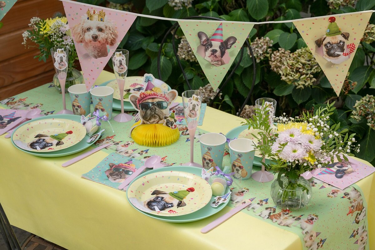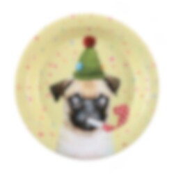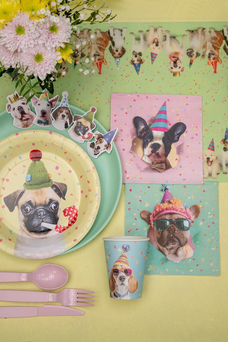 Sjove paptallerkener med et festligt hundemotiv, som passer perfekt til fødselsdagsfester, fester og andre fejringer, hvor borddækningen gerne må skille sig ud. Hunden med festhat og partytut giver tallerkenerne et legende udtryk, mens konfettimønstret i baggrunden forstærker følelsen af fest.