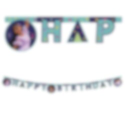 Fin guirlande, der har motiver af karaktererne fra filmen Encanto og med bogstaver, hvor der står "Happy Birthday". Guirlanden er 2 meter lang.