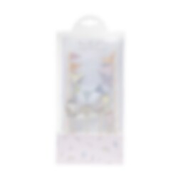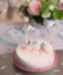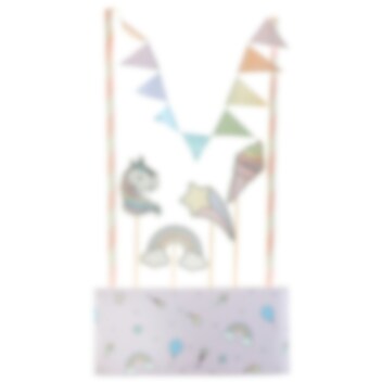Kagedekorationssæt, som du kan bruge til at dekorere kagen til enhjørningefesten. Pakken indeholder 2 lyserøde og hvidstribede papstrå med en flagguirlande i blandede farver og 4 pinde med motiver af en enhjørning, en regnbue, en stjerne og en is.