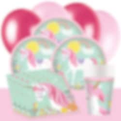 Denne færdige festpakke med smukke enhjørningstilbehør inkluderer tallerkener (23 cm), papkrus (250 ml) og servietter (33 x 33 cm) til 8, 16 eller 24 personer. Derudover indgår 10 stk. lyserøde balloner og 10 stk. pinkfarvede balloner og en lyserød borddug i plast. (137 x 274 cm). I pakken til 24 gæster indgår 2 stk. bordduge.