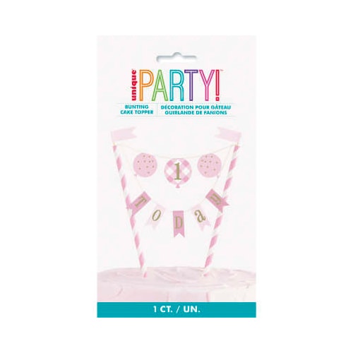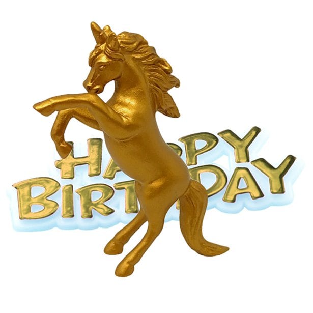 Flot kagedekoration med guldfarvet enhjørning og et skilt med teksten 'Happy Birthday'. Enhjørningen er ca. 9 cm høj og tekstskiltet er ca. 6 x 3 cm stort.