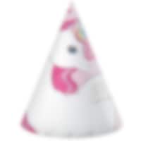6 festhatte med søde enhjørningsmotiver. Sjove at have til fødselsdagen med enhjørningstema. Hattene er ca. 19 cm høje og holdes på plads med en elastik.