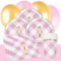 Fejr den første store milepæl med elegance og stil med denne komplette festpakke, perfekt til en 1-årsfest. Pakken indeholder lyserøde tallerkener med guldfoliering (23 cm), rosaternet papkrus med guldfolie kant (270 ml) og servietter (33 x 33 cm) til 8, 16 eller 24 personer. Derudover medfølger 10 lyserøde balloner og 10 guldfarvede balloner, samt en lyserød plastdug (137 x 274 cm). Pakken til 24 gæster indeholder 2 duge.