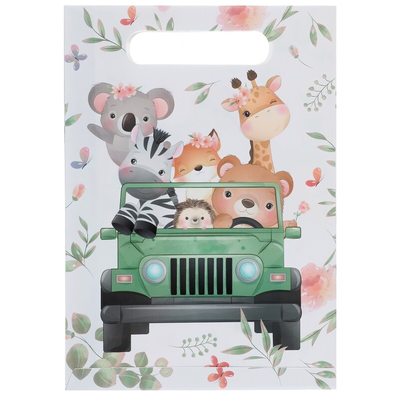 Denne søde safari-tema festpakke inkluderer tallerkner (22,5 cm), papkrus (270 ml) og servietter (33 x 33 cm) til 10 eller 20 personer, derudover 10 stk. lysrøde og 10 stk. lyselilla balloner og en lyserød plastdug (137 x 274 cm).