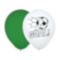 Skab den rette stemning til fodboldfødselsdagen med disse festlige balloner i grønt og hvidt. Den hvide ballon er dekoreret med et tydeligt fodboldmotiv og teksten GOAL!, mens den grønne ballon er en flot og passende kontrast, der leder tankerne hen på fodboldbanen.