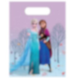 6 slikposer i plast med et smukt vintermotiv af Elsa og Anna foran snedækkede træer. Perfekte til at fylde med slik og små overraskelser, som børnene kan tage med hjem efter fødselsdagen med Frost-tema.