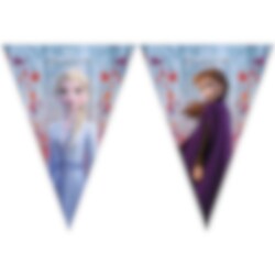 Flagguirlander i plastik med et flot motiv af søstrene Anna og Elsa fra Disney filmen Frost 2. En imponerende dekoration til festen. Flagbanneret er ca. 2,3 meter langt.