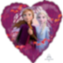 Hjerteformed folieballon i snukke farver med motiv af Anna og Elsa fra filmen Frost 2. Ballonen er cirka 45 cm i diameter når den er pustet op.