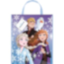 Gaveposer i fine farver med motiv af Anna, Elsa, Kristoffer og Olaf fra filmen Frost 2. Læg gaven i denne pose når det venter fest med Frost-tema. Posen er lavet af plastik og er cirka 33 x 28 cm stor.