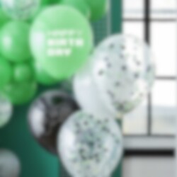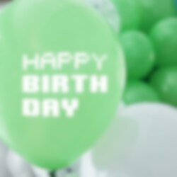 5 stk. latexballoner i stilfulde farver, hvoraf den ene har teksten "Happy Birthday", to af dem har motiver af spilkontrollere og to af dem er fyldt med farverig konfetti. Ballonerne er cirka 25 cm i diameter oppustet.