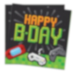 16 stk. sorte og grønne servietter med seje spilmotiver og teksten Happy B-day i midten. Servietterne er i to lag og er ca. 33x33cm store når de er foldet ud.