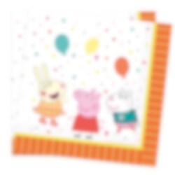 16 stk. servietter med orange og gule kanter, hvid baggrund og med motiv af Gurli Gris og hendes venner Rebecca Rabbit og Suzy Sheep samt farverige balloner og konfetti. Servietterne er 2-lags og er ca. 33 x 33 cm store udfoldet.
