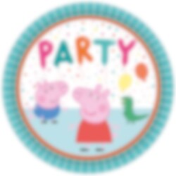8 stk. runde paptallerkener med orange og turkise kanter, hvid og lyseblå baggrund, med motiv af Gurli Gris, George Gris, en legetøjsdinosaur, farverig konfetti, balloner og teksten "Party". Tallerkenerne er ca. 23 cm i diameter.