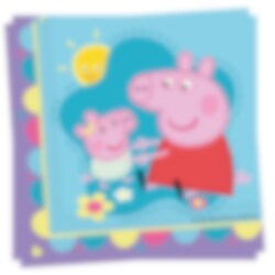 20 servietter med et dejligt motiv af Gurli Gris og en lille gris mod en turkis baggrund med solskin og blomster. Perfekte når du vil skabe en ensartet og glad dækning til fødselsdagen med Gurli Gris-tema.