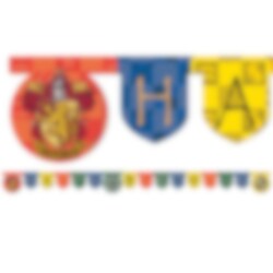 Farverig guirlande med teksten Happy Birthday og med sjovt motiv af emblemerne fra Harry Potter. En sjov dekoration til Harry Potter-festen. Guirlanden er ca. 2 m lang.
