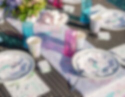 Skab en magisk borddækning til din havfrue-fest med denne bordløber med motiver af havfruer og havfruer og andre havrelaterede ting. Passer smukt sammen med vores andet tilbehør med havfrue-tema som f.eks. en tallerken, et krus og en serviet. Bordløberen er lavet af polyester og er ca. 30 cm bred og 5 meter lang.