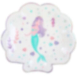 10 muslingeformede tallerkener i hvid farve med sølvfarvede kanter og med et motiv af en smuk havfrue omgivet af farverige planter og muslinger. Perfekt til at dække bordet til havfruefesten. Kombiner tallerkenerne med krus, servietter osv. fra samme tema for at skabe et smart look. Pladen måler ca. 22,7 x 21 cm.
