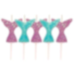 5 stk. havfruehale kagelys med glimmer. Perfekte at dekorere kagen med til fester med havfruetema. Lysene er ca. 5 cm høje.
