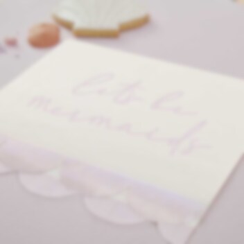 16 stk. lyserøde servietter med perlemorsagtige vipper, der efterligner skæl og har motiver af teksten "Let's be mermaids" i en pink farve i midten. Lækkert at tage med til borddækningen til havfruefesten.