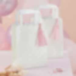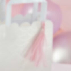 5 stk. hvide slikposer med motiver af havfrueskæl og lyserøde kvaster, der hænger ved de perlemorskinnene håndtag. Fyld poserne med slik og nogle overraskelser fra havet og server gæsterne disse, når det er tid til en fest med havfruetema.