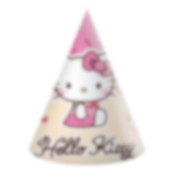 6 festhatte med motiver af Hello Kitty og Kuromi. Hattene er ca 19 cm høje og holdes på plads med en elastikbånd.