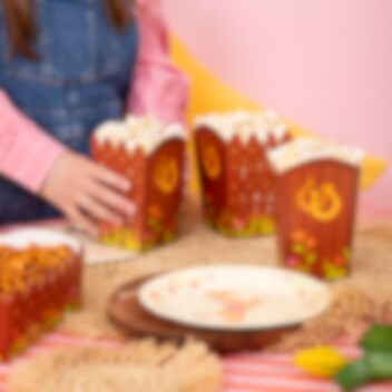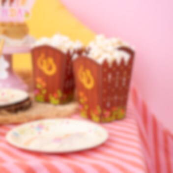 Skab en hyggelig og landlig stemning til festen med disse fine popcornbægre med hestetema. Med et design, der ligner en staldvæg pyntet med hestesko og blomster, er de perfekte til små ryttere og hesteglade børn.