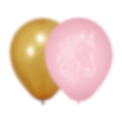 Skab en drømmende og festlig stemning til fødselsdagen med disse fine balloner i rosa og guld. Den rosa ballon er dekoreret med et smukt hestemotiv med blomster, mens den guldfarvede ballon giver en elegant og skinnende kontrast, som passer perfekt til en hestefødselsdag.