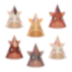 Disse charmerende festhatte forestiller farverige hesteansigter med forskellige udtryk og farver. En legende og sød detalje, der gør børnefesten endnu festligere. Hattene er cirka 16 cm høje og holdes på plads med en behagelig elastik.